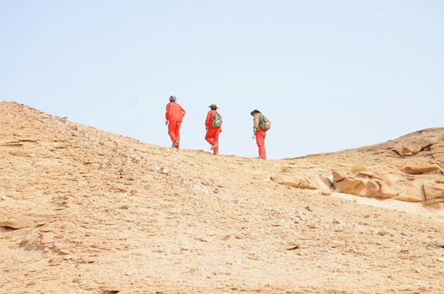 新疆鑫匯公司的野馬泉西金礦項目工作區(qū)距離哈密市155公里,工期為6-10月,需完成6千米的鉆探工作任務(wù)、16平方公里的地質(zhì)剖面等。礦區(qū)內(nèi)山丘連綿不絕,自7月開始,每天下午礦區(qū)地面溫度均超過普通溫度計的最高刻度,屬于“爆表”狀態(tài)。因工作任務(wù)緊,地質(zhì)隊員們每天早上7點出發(fā),中午之前要返回基地,傍晚重新出發(fā),22點前趕回基地,開展剖面測量和鉆探編錄工作,以避開正午的酷熱。為了不被灼傷,地質(zhì)隊員和鉆探工人把自己包裹得嚴(yán)嚴(yán)實實,手拎地質(zhì)錘敲下每一個礦化線索,身背樣品包裝載好沉甸甸的希望。汗水浸濕衣衫,腳底磨出老繭,他們踏遍了礦區(qū)的角角落落,最終繪制出整個礦區(qū)的礦化藍圖。