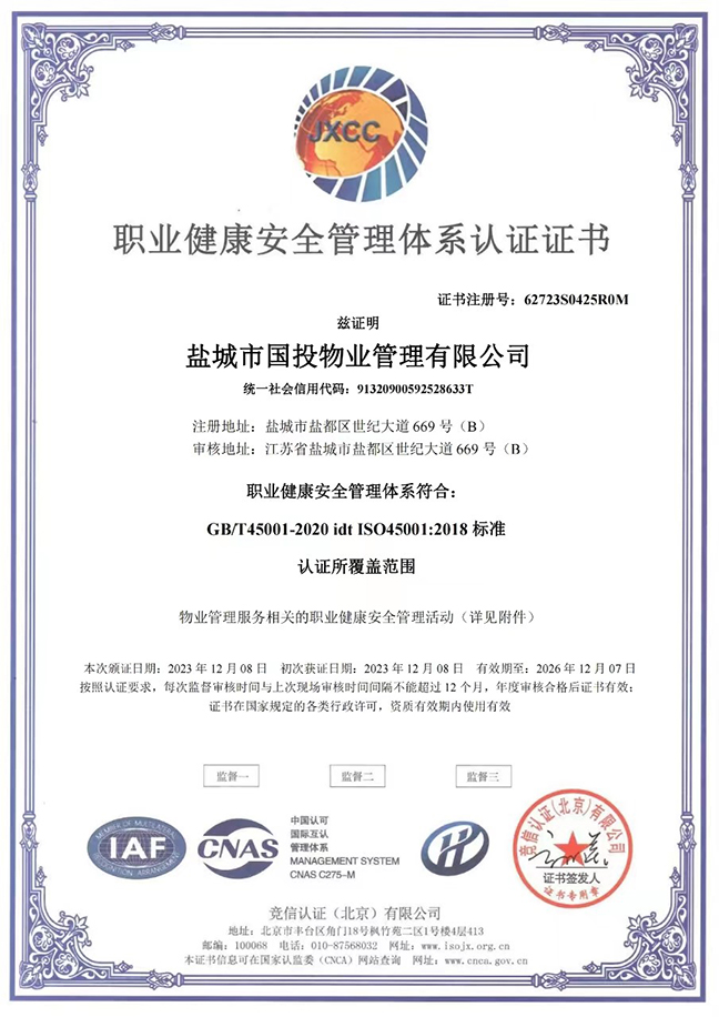 日前,鹽城國(guó)投物業(yè)公司順利取得ISO“三體系”(ISO9001質(zhì)量管理體系、ISO14001環(huán)境管理體系、ISO45001職業(yè)健康安全管理體系)認(rèn)證證書。這是公司在提升企業(yè)綜合實(shí)力過(guò)程中取得的新進(jìn)展,標(biāo)志著公司在精細(xì)化、制度化、規(guī)范化管理方面邁上新臺(tái)階。